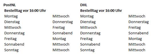 Achtung: Diese Lieferzeiten wurden von PostNL und DHL angegeben. Es kann auch vorkommen, dass eine Sendung später zugestellt wird. Wir haben leider keinen Einfluss auf eventuelle Verspätungen während des Versendevorganges.