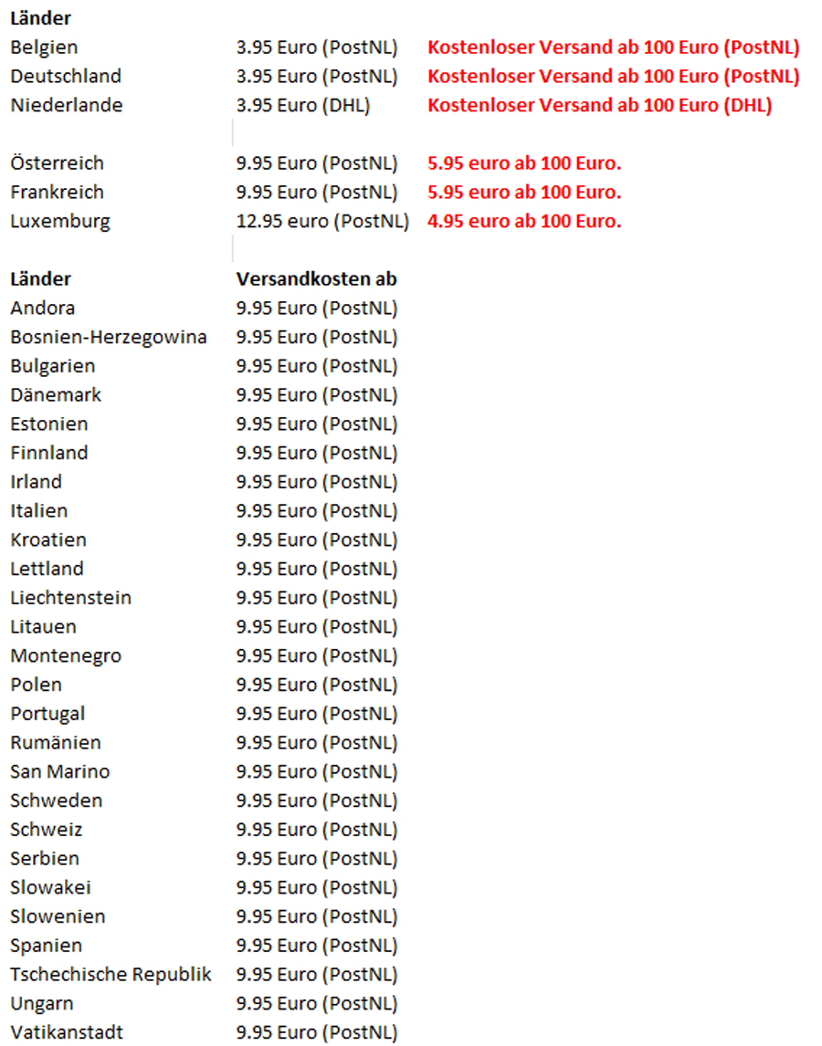 Für Bestellungen, die abgeholt werden, zahlen Sie keine Versandkosten. Es ist möglich, die Artikel in Gorinchem (Niederlande) abzuholen. Der Ort kann während des Bestellvorganges angegeben werden. Für den Versand der Bestellungen verlangen wir einen kleinen Beitrag.